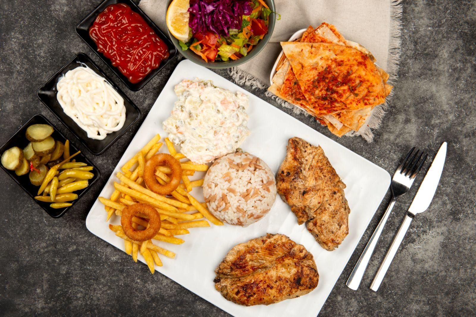 Pilav, Rus Salatası, Mevsim Salatası, Patates Cipsi, Soğan Halkası 2 adet
