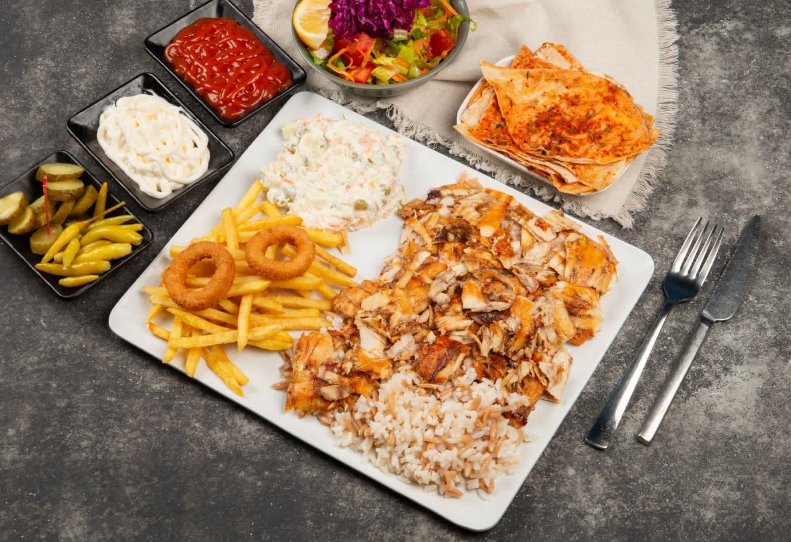 Pilav, Rus Salatası, Mevsim Salatası, Patates Cipsi, Soğan Halkası 2 adet